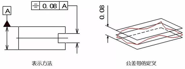 示例:公差帶是位于距離0.08mm的兩個(gè)平行平面之間的區(qū)域。
