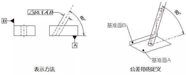 示例2:在公差值前加注記號Φ,則公差帶必須位于直徑為0.1mm的圓柱面內(nèi)。該公差帶應(yīng)平行于垂直于基準(zhǔn)A的平面B,并與基準(zhǔn)A呈理論正確角度60°。