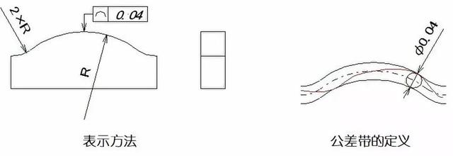示例:公差帶是由包絡(luò)一系列直徑為公差0.04mm的圓的兩包絡(luò)線之間的區(qū)域。諸圓的圓心位于具有理論正確幾何形狀的線上。