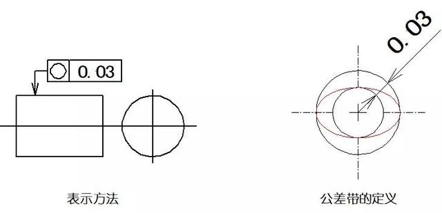 示例:公差帶必須在同一正截面上,半徑差為公差值0.03mm的兩個(gè)同心圓之間的區(qū)域。