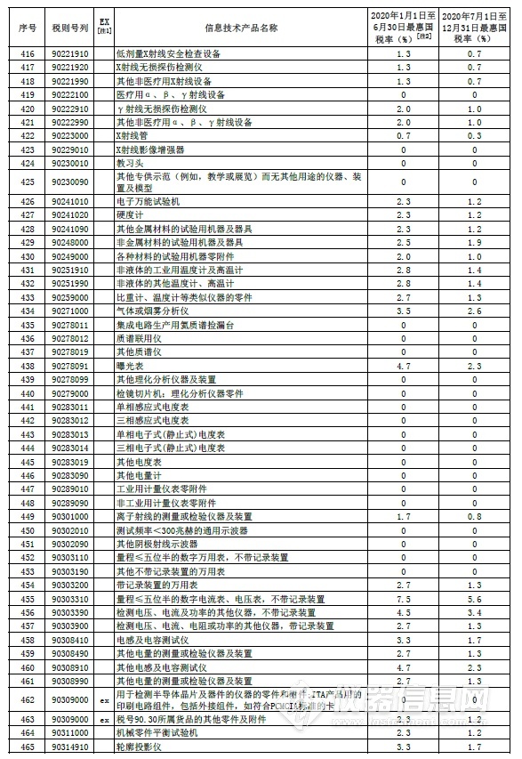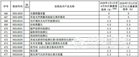 部分信息技術(shù)產(chǎn)品最惠國(guó)稅率表中的儀器