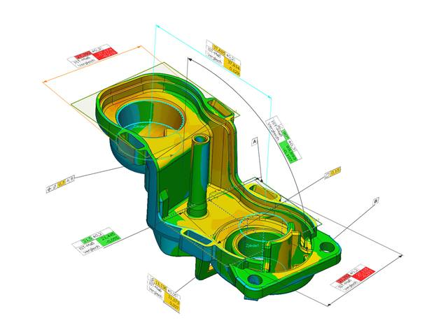 工業(yè)光學(xué)3D掃描儀通過(guò)高度精確的3D點(diǎn)云形式,生成實(shí)際加工零件的精確圖像。掃描數(shù)據(jù)不僅可以對(duì)特定點(diǎn)進(jìn)行三維評(píng)價(jià),還可以直接與數(shù)字目標(biāo)模型(例如:CAD數(shù)據(jù)集)進(jìn)行比較。通過(guò)色階可以一目了然地看到偏差,并且可以輕松地定位到錯(cuò)誤點(diǎn)。