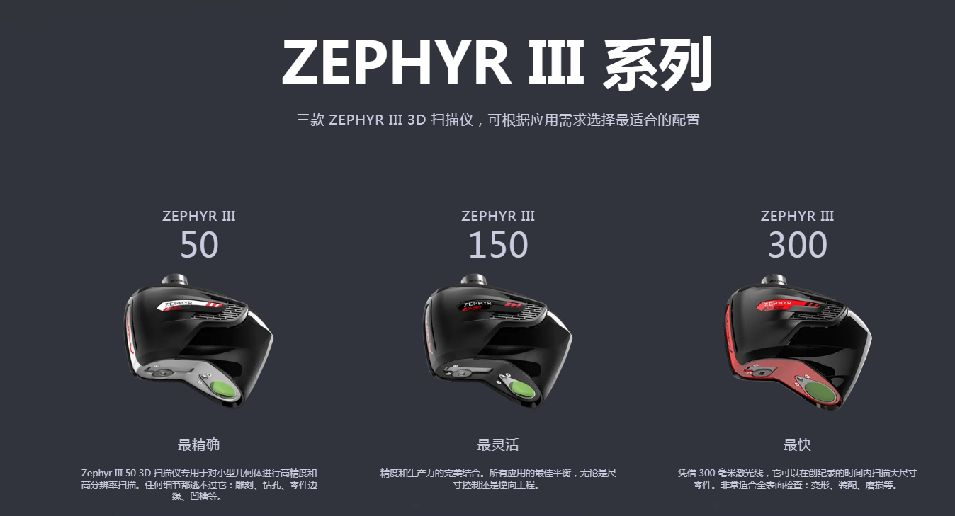 Zephyr III 高端掃描儀搭配150mm或50mm激光線,能在數(shù)秒間輕松掃描復雜物體。藍色激光線可直接掃描黑色或光澤表面。作為通用產(chǎn)品,它們滿足CMM所有測量需求,并且可以在測量臂、機器人、機床和光學跟蹤儀上靈活切換。